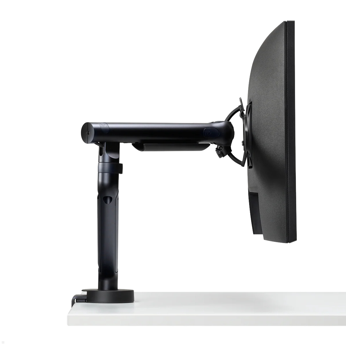 The revised cable management with an intelligent cable channel, integrated middle clip and removable side covers keeps the desk tidy. The innovative tilt-adjustment screw mechanism allows quick friction adjustments for different screen sizes and curvature radii. Portrait and landscape rotation is possible without effort. The timeless, minimalist design is compatible with existing desk clamps and accessories like the Ondo and can be easily disassembled and recycled at end of life. Thanks to its adjustable desk clamp, the Colebrook Bosson Saunders Flo Dynamic monitor arm can be easily attached to any desk up to 38 mm thick.