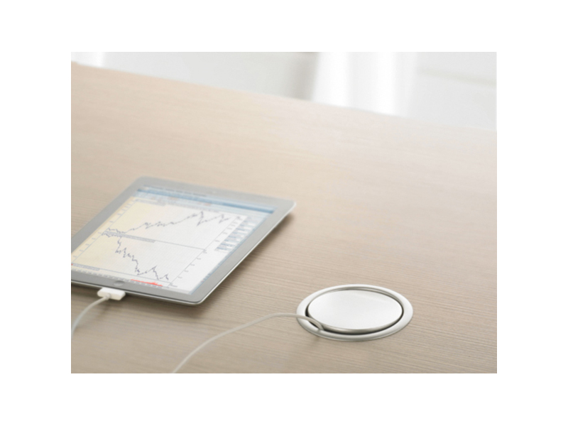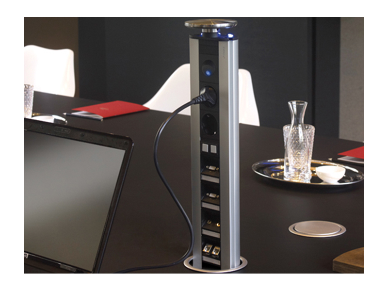 Der Port sorgt für Übersicht auf dem Schreibtisch, indem er störende Kabel einfach zum Verschwinden bringt. Mit einem Fingerdruck lässt er sich in der Arbeitsplatte versenken und bei Bedarf hervorholen. Auch in Gebrauch versinkt er bündig in der Tischplatte und lässt nur die Strom-, Daten- und Multimediakabel zum Vorschein kommen. Optional ist der Port dezent in blau, rot, grün oder weiß LED-beleuchtet. Für sein Design wurde er mit dem “red dot award” ausgezeichnet.