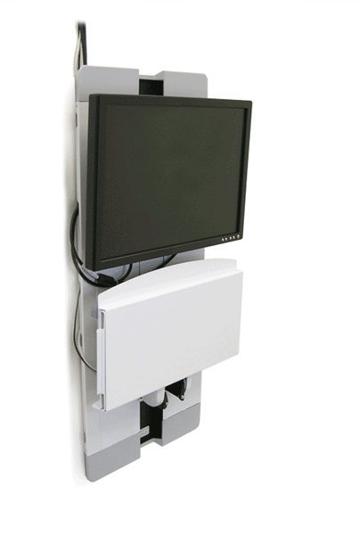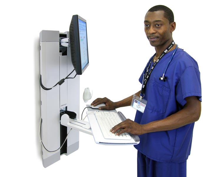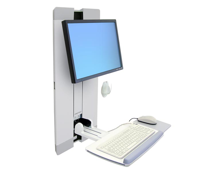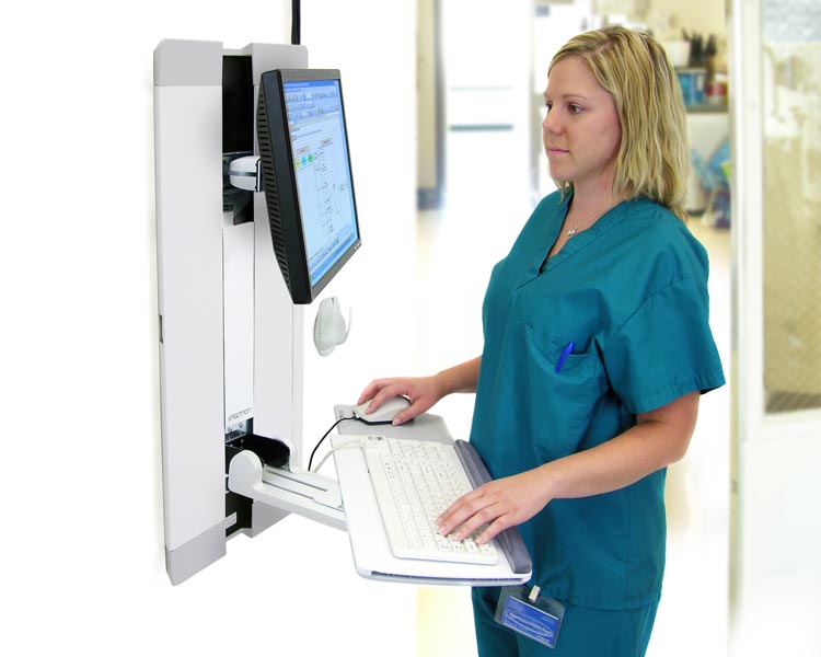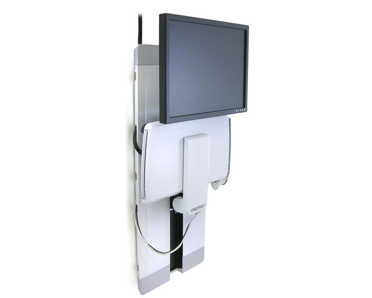 The slide-out, negative tilt keyboard enhances user comfort, while the monitor and keyboard pan capability promote patient-caregiver interaction. A unique cable management system conceals and organizes cords and makes cleaning a snap!