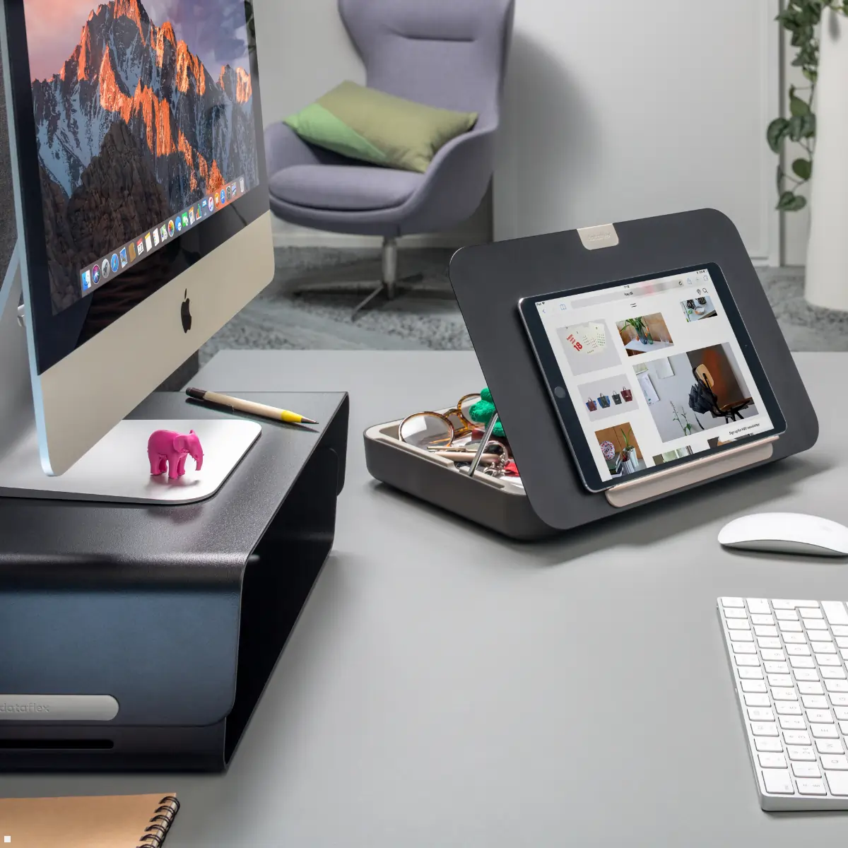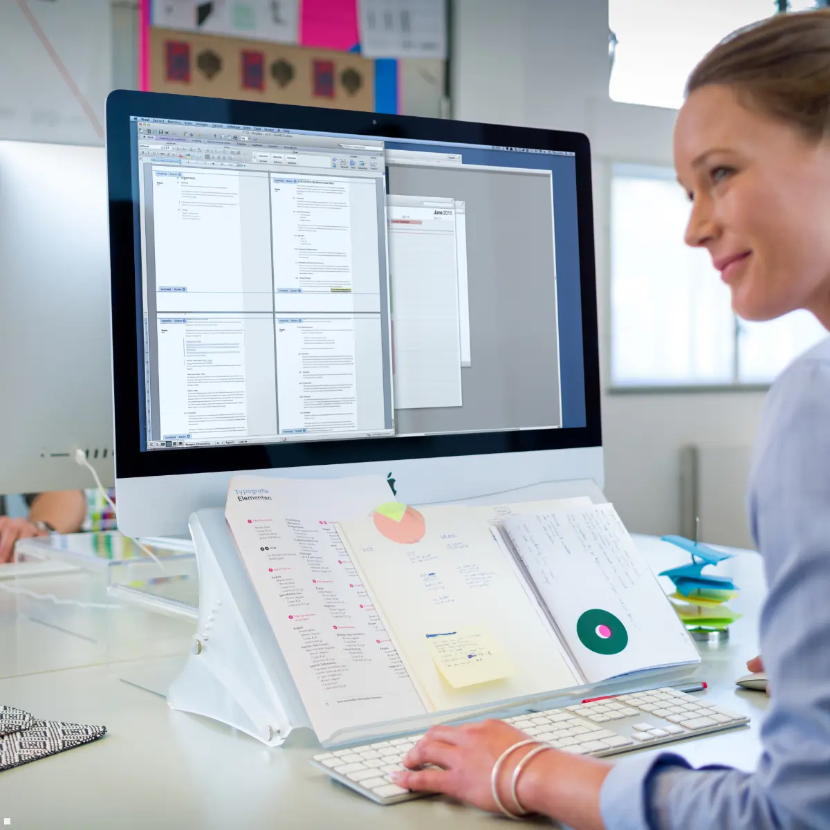Ergonomic storage for paper documents creates an overview and order on the desk and ensures a healthier way of working. The document holder is ideally positioned between the keyboard and the screen. As a result, the documents are in the direct field of view, which enables a quick change of view between the keyboard, template and screen. This optimal positioning can prevent premature signs of fatigue and increase overall productivity.