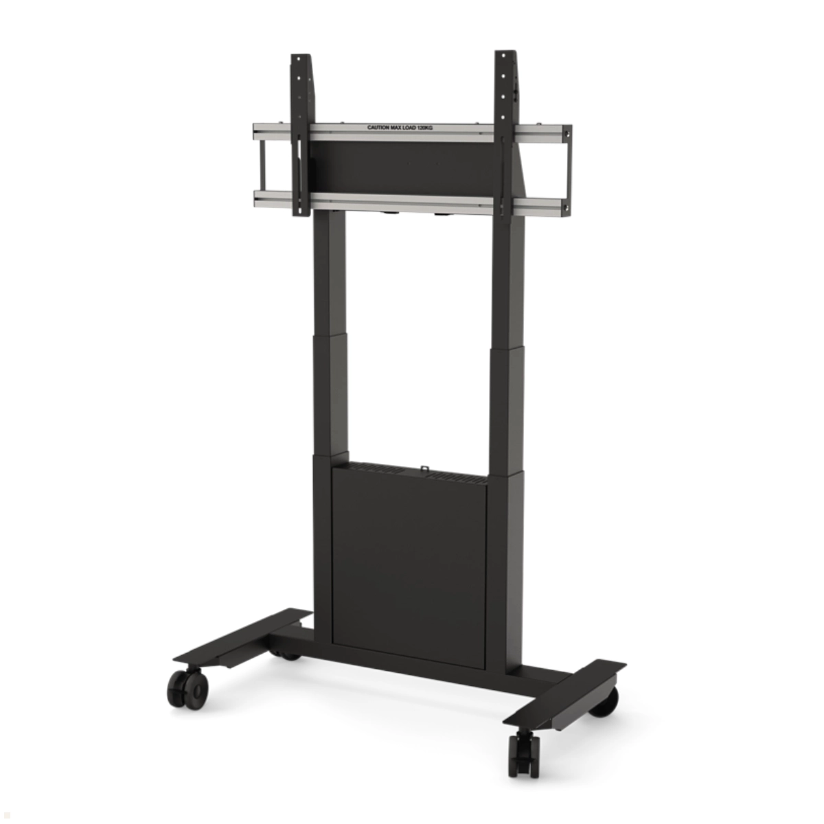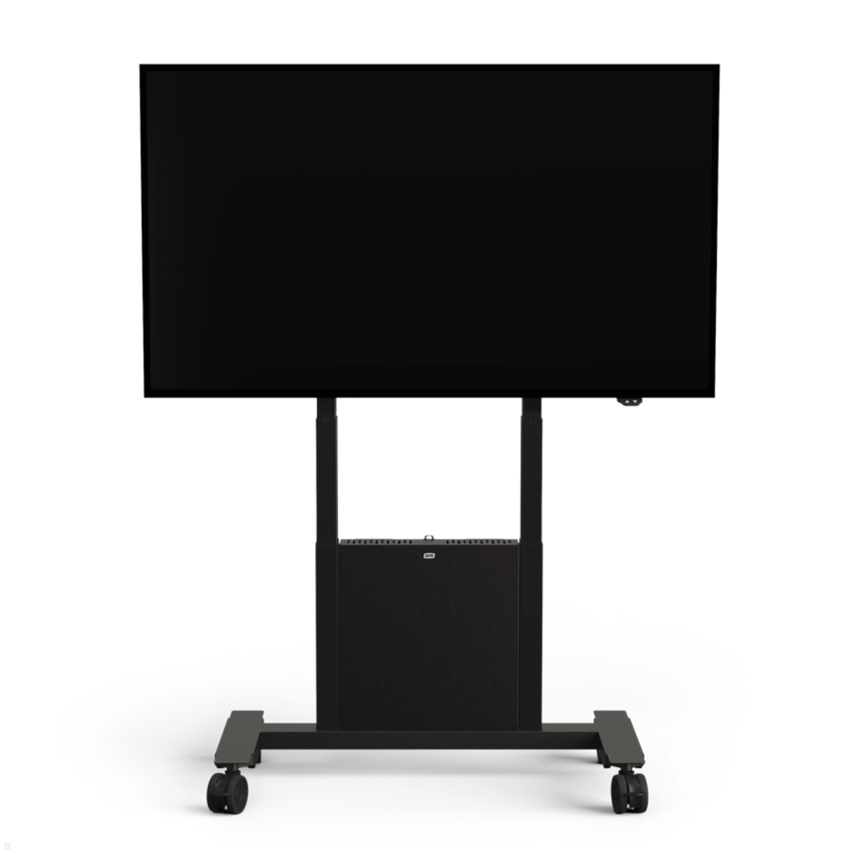 With its sturdy steel construction, integrated adjustable shelf, and smooth-rolling wheels, the stand can be easily positioned in conference rooms, trade shows, classrooms, or living spaces. A built-in cable management system keeps cables neatly organized, while locking casters ensure a secure and steady setup.