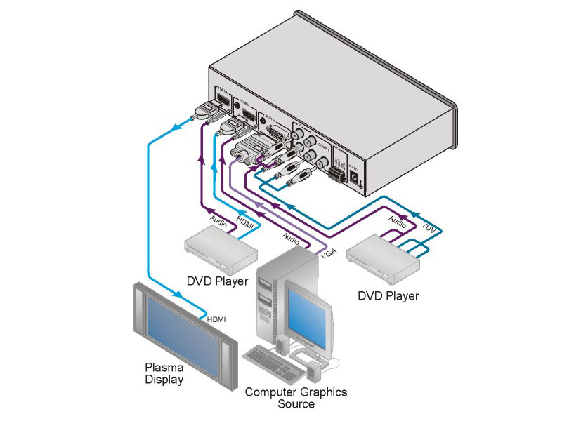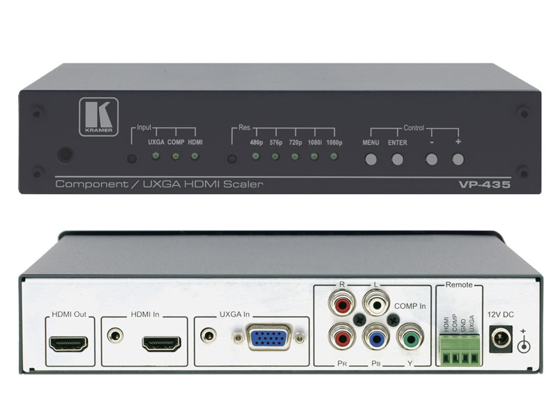 The Kramer VP−435 is a high−quality format converter for component video, computer graphics video, HDMI video and unbalanced stereo audio signals. It scales the selected video signal to a computer graphics or HDTV output resolution, embeds the audio and outputs an HDMI signal.