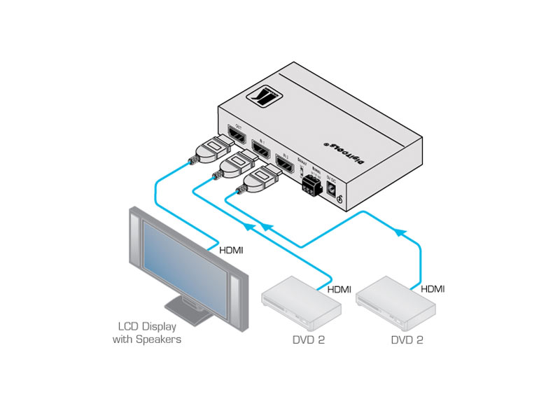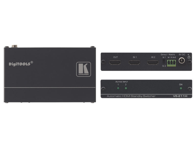 The Kramer VS-211H is a high-performance automatic standby switcher for HDMI video signals. The unit automatically switches to the secondary input whenever the primary video signal is interrupted. If the primary signal reappears, the unit automatically switches back to the primary input.