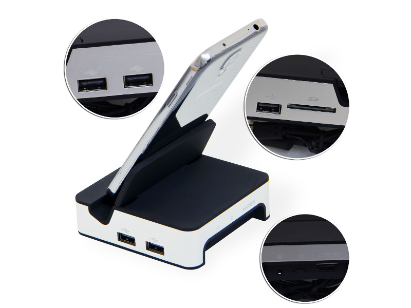 Die Dockingstation bietet Ihnen drei USB-Ports, einen HDMI-Ausgang, Audio-Out und einen SD-Kartenleser in einem Gerät. Der Clou dabei ist die gleichzeitige Nutzung aller Fähigkeiten. Sie können z.B. einen Monitor mit einer USB-Maus und einer Tastatur zusammen an die Dockingstation anschließen und so im Internet surfen oder Textbearbeitung machen. Oder schließen Sie einfach Ihren Fernseher/Beamer und Ihre HiFi-Anlage an unser CleverDock an und erleben Filme von Youtube, einem USB-Stick oder einer externen Festplatte in groß!