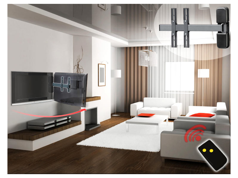 If installed close to the end of a wall it reaches a rotation up to 180° allowing watching TV also in two different rooms! Innovating and reliable motorized versions with remote control handling, with internal clutch, ensuring childproof safety. Solid, elegant and with refined design it’s an excellent furnishing accessory also when the TV is open and it is visible.