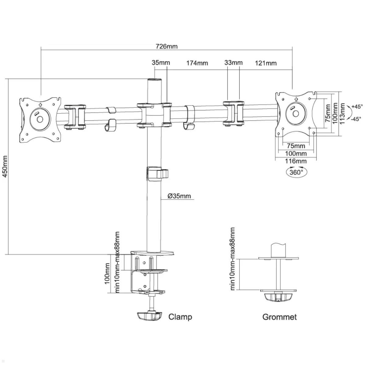 The Neomounts NM-D135D 2-fold monitor desk mount in white is suitable for two monitors from 10 to 27 inches with a maximum weight of up to 8 kg per monitor. It is possible to mount the bracket on the desk using a desk clamp or a desk through-bolt mounting. The height of the screens can be adjusted manually from 0 to 400 mm. Displays with a VESA mount of 75x75 and 100x100 mm are compatible with the mount.