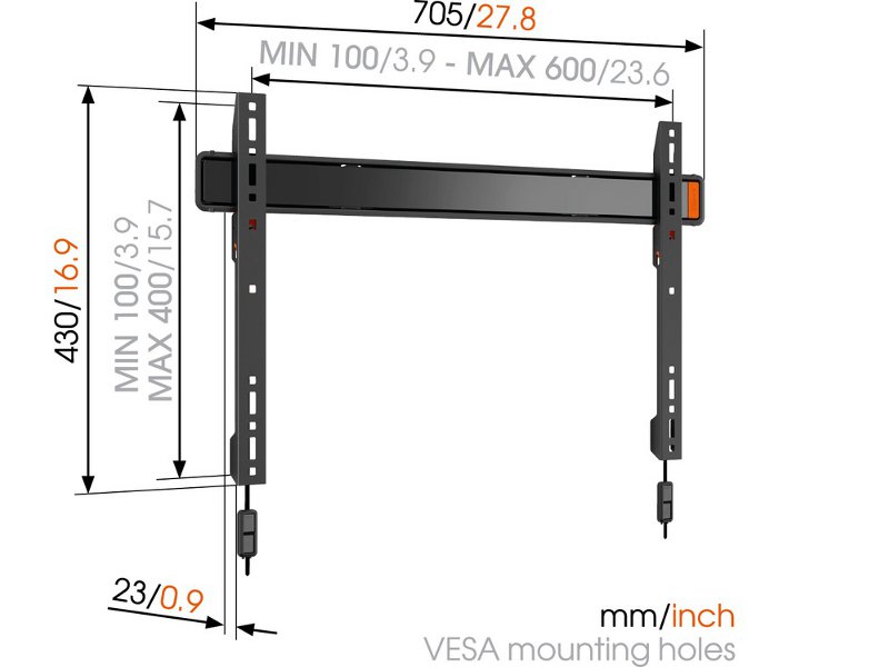 - VESA Standard 100x100, 200x100, 200x200, 300x300, 400x400, 600x400mm, VESA MIS-F (max. 600x400 mm)